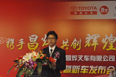 杭州昌烨叉车有限公司董事长巫永辉先生发表讲话,他向所有来参加开业的嘉宾表示诚挚的谢意,总部设在台湾的昌烨公司前身为1950年创立于高雄的永安汽车维修厂,1975年成立永安重型机械有限公司,1997年更名为昌烨机械有限公司,以超过半个世纪的从事日本吊机、发电机、产业车辆的贸易和维修经验,为各地区工商界提供更紧密的销售服务, 2010年正式获得丰田叉车在浙江的代理授权,主要从事丰田叉车在该地区的销售和售后服务。昌烨凭借多年的经验和一流的服务团队,为全球最大叉车制造商在浙江地区提供优质的服务。通过导入BT电动车辆,丰田产业车辆能够提供Class1~Class5类物料搬运设备的所有产品,以完美的解决方案满足客户在物料搬运领域一站式需求。
