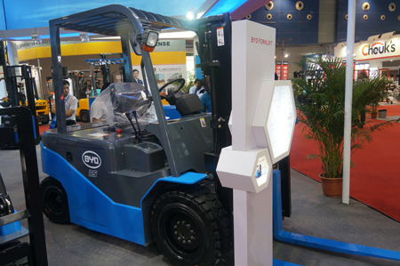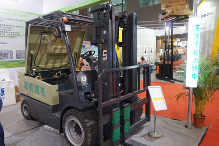 在节能减排、低碳环保意识渐受重视的趋势下,新兴能源相关产业将会因市场的需求而快速成长,专注于动力锂电的绥中正国新能源科技有限公司携磷酸铁锂电池,展示出电动叉车新能源的优势,具有比能量大、循环寿命长、性价比高、安全性能高及环保、无污染、大倍功率充放电、电池免维护、无记忆效应可随时充放电等特点,并成功与中美合资-浙江尤恩叉车股份有限公司共同研发出5吨电动叉车。本届展会比亚迪也再次携全系电动叉车产品盛装出席,同样以绿色的环保理念和独一无二的全球领先铁电池技术再次受到观众热捧。比亚迪铁电池零污染、高安全、免维护、长寿命、可大倍率充放电、综合成本低等优点,不只是应用在比亚迪汽车上,还应用在电动叉车上,并首次推出3.5吨电动叉车。
